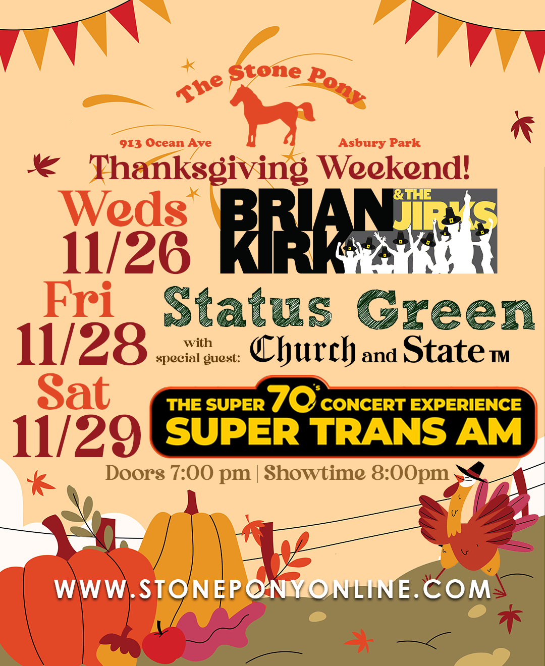 Thanksgiving ROCKS at the Stone Pony! Join us for an awesome week of Holiday shows starting Wed 11/26 with legendary frontman Brian Kirk & The Jirks-early showtime 8pm. Tickets and more info for ALL Stone Pony shows are here: Home - The Stone Pony